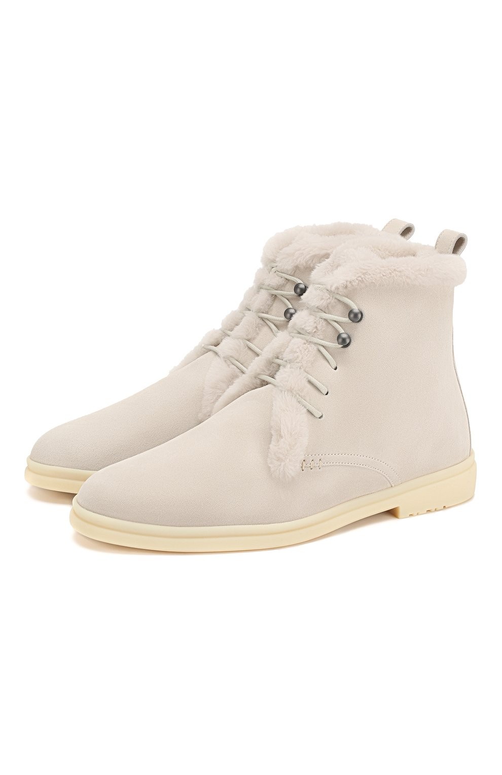 Светло-бежевые ботинки Ylvi Walk из осенне-зимней коллекции 2019 года станут хорошим выбором для прогулки в непогоду. Все дело в материале: мастера марки, основанной Пьетро Лоро Пьяна, выполнили модель из фактурной замши с влагоотталкивающим покрытием и утеплили подкладкой из густого меха нутрии.