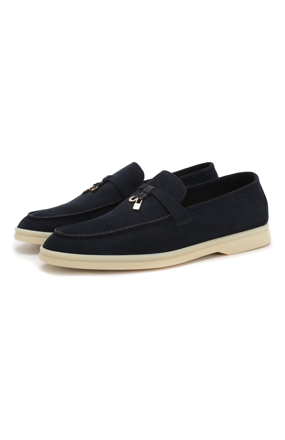 Темно-синие лоферы Summer Charms Walk — идеальный вариант городской обуви. Мягкая замша с бархатистой текстурой позволяет коже дышать, а благодаря отсутствию подкладки туфли садятся точно по ноге. Модель с белой каучуковой подошвой и декоративными подвесками My Charms вошла в весенне-летнюю коллекцию марки, основанной Пьетро Лоро Пьяна.